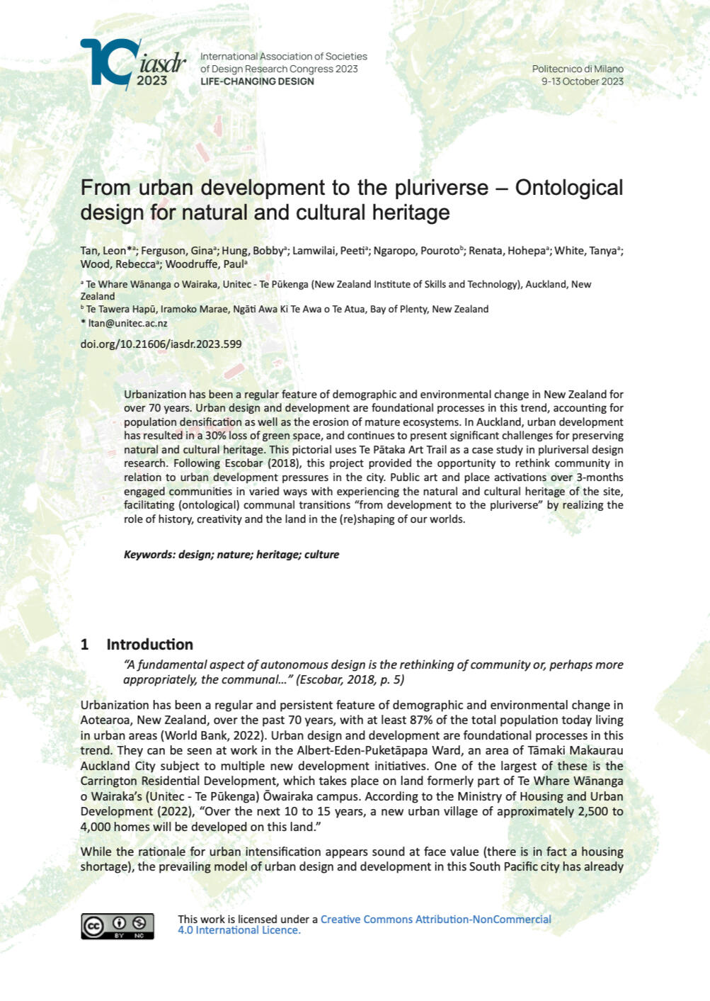 Tan, L., Ferguson, G., Hung, B., Lamwilai, P., Ngaropo, P., Renata, H., White, T., Wood, R., & Woodruffe, P. (2023). From urban development to the pluriverse: Ontological design for natural and cultural heritage. In D. De Sainz Molestina, L. Galluzzo, F. Rizzo, & D. Spallazzo (Eds.), IASDR 2023: Life-changing design, 9–13 October, Milan, Italy.